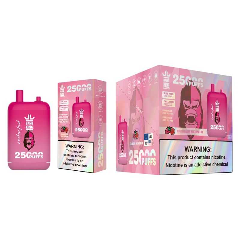 The Ultimate 25K Puffs Vaping Experience Enjoy Up to 25,000 Puffs of Pure Satisfaction. Bang King 25000 puff Disposable Vape 0% 2% 3% 5% nicotine, 46ml e-liquid, dual pod system, 650mAh battery, 1.0 Ohm mesh coil, type-C rechargeable, bulk buy disposable vape wholesale.