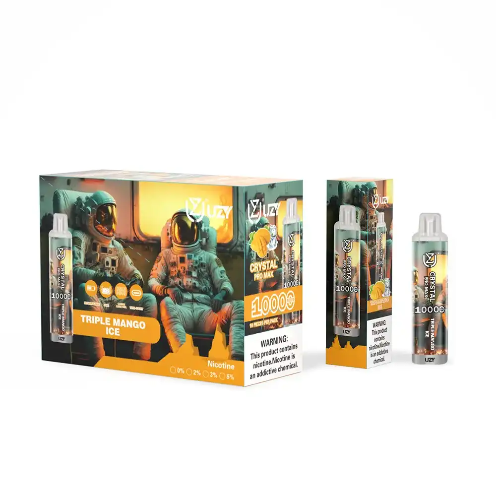 The UZY Crystal Pro Max 10K(10000) Puffs Disposable Vape Original Edition Disposable Vape Pen is packed in boxes containing 10 pieces each, making it convenient for bulk purchases. The manufacturing date (MFD) can be found on the packaging, ensuring freshness and quality.